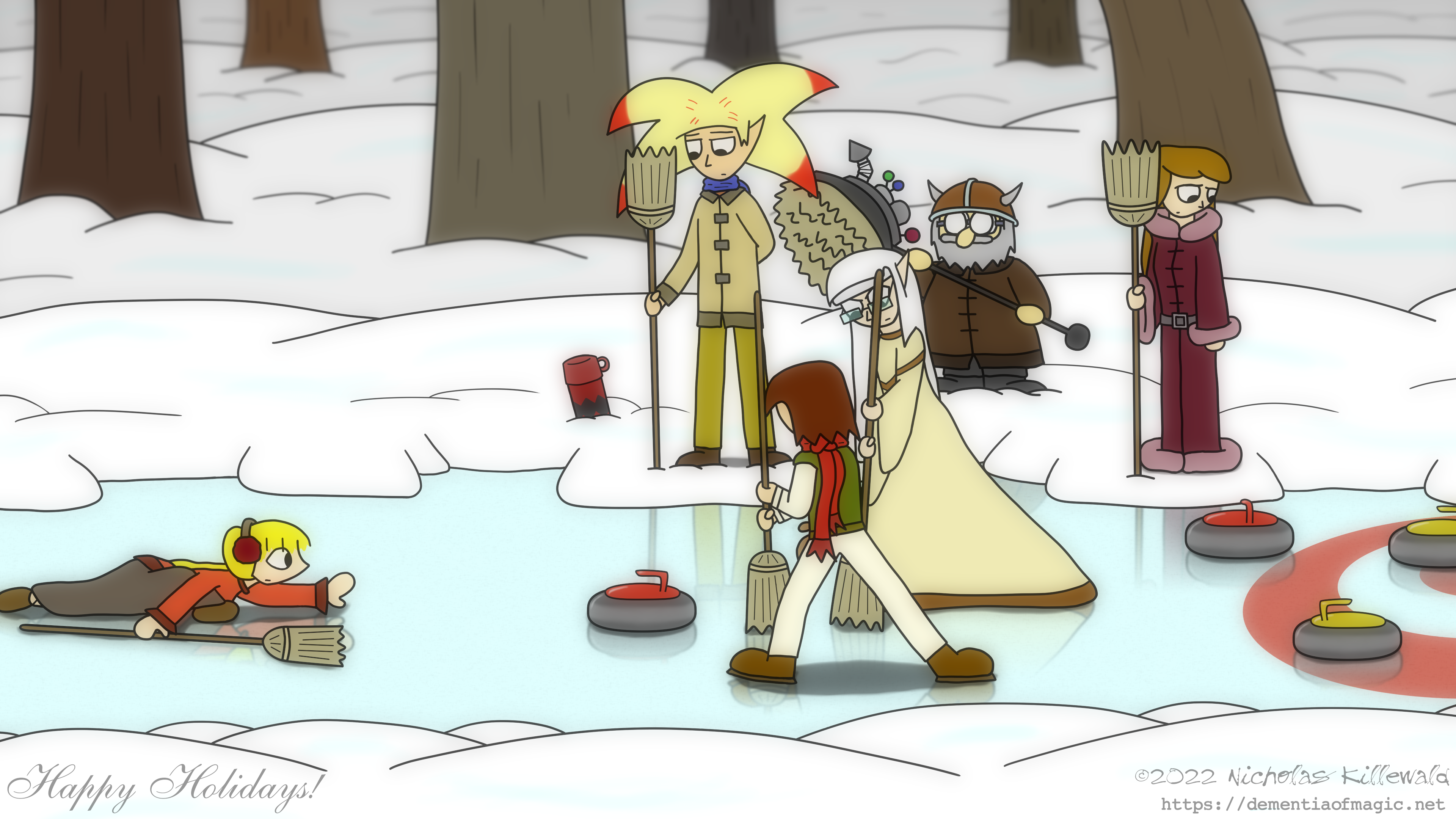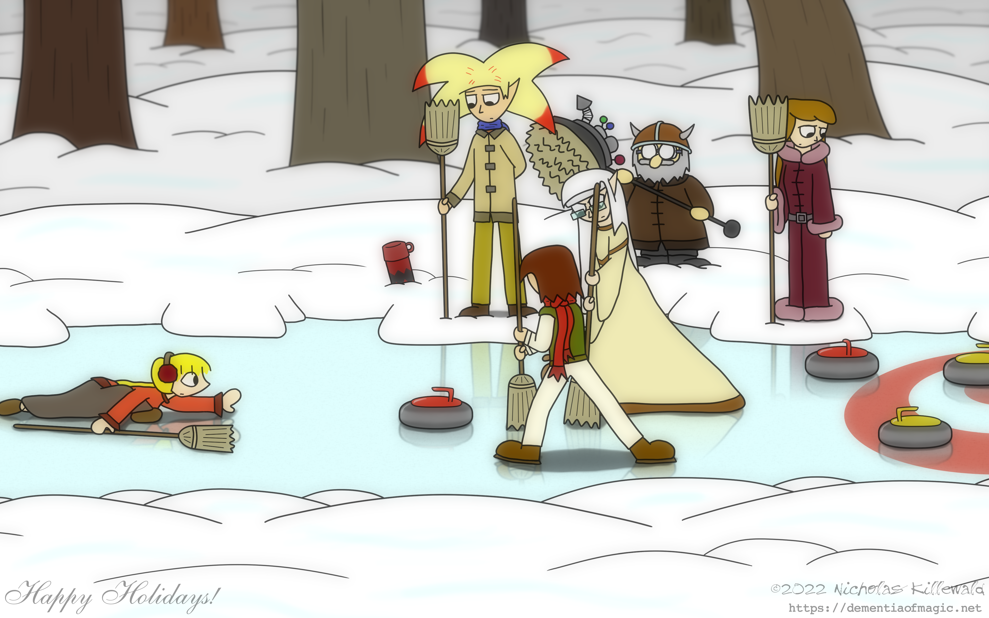 See? It was only TWO years since the last one this time! It's a 2022 holiday wallpaper! Well, I guess it's less "holiday" than it is just "winter", but shut up I just wanted to draw a curling scene this time around! This is almost certainly not canon! Enjoy! And happy holidays!